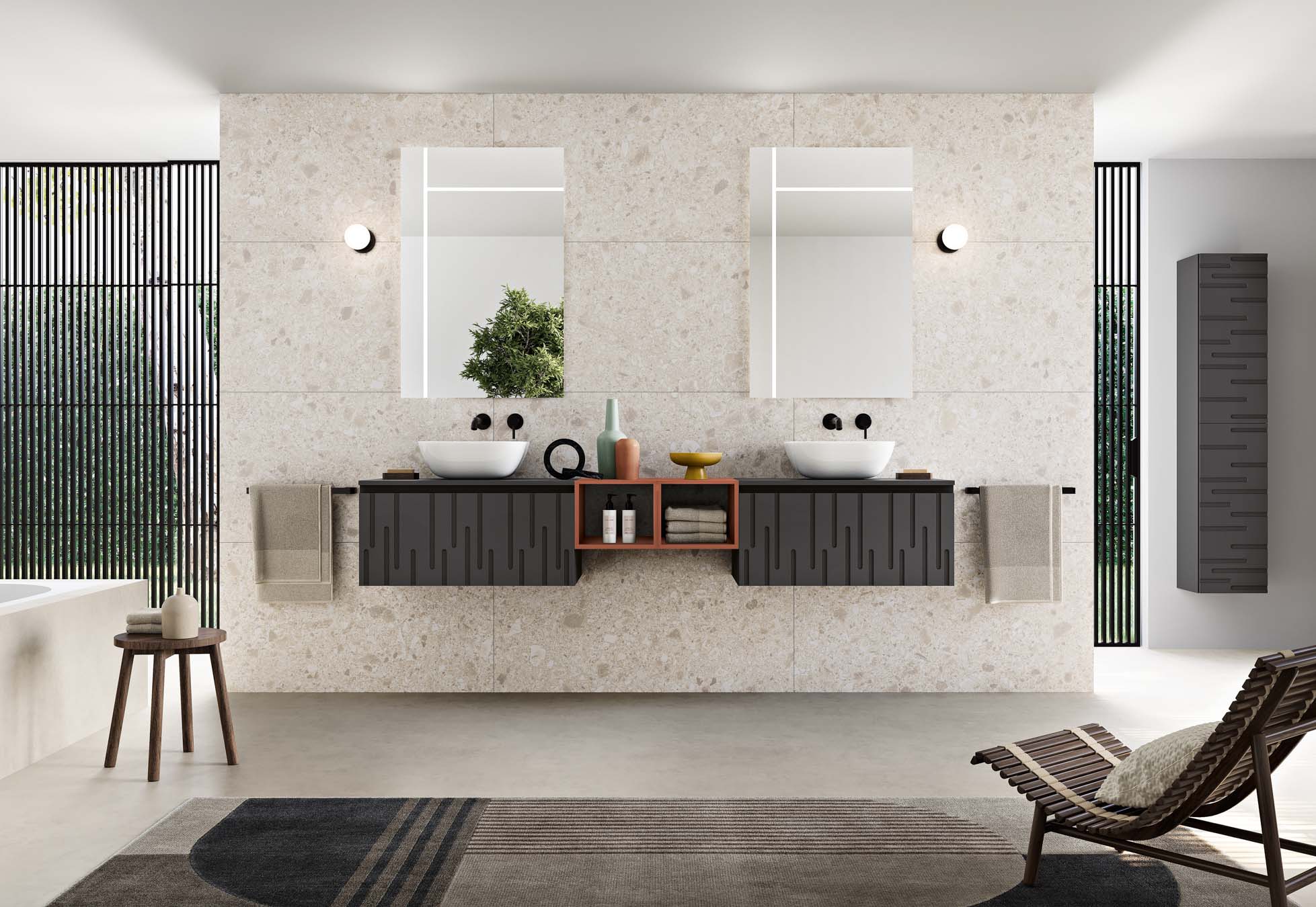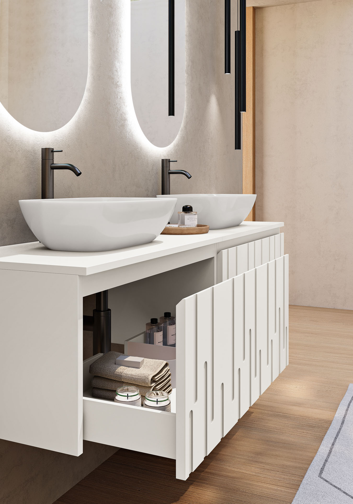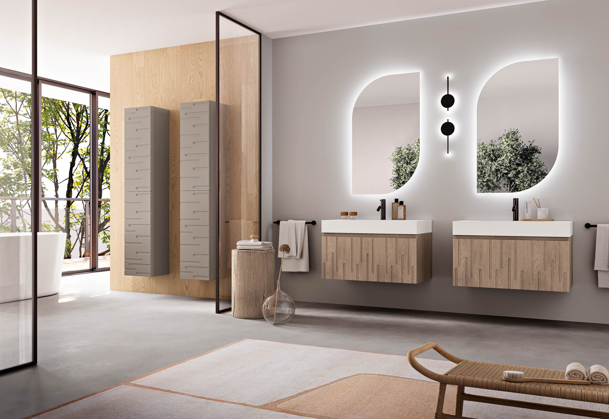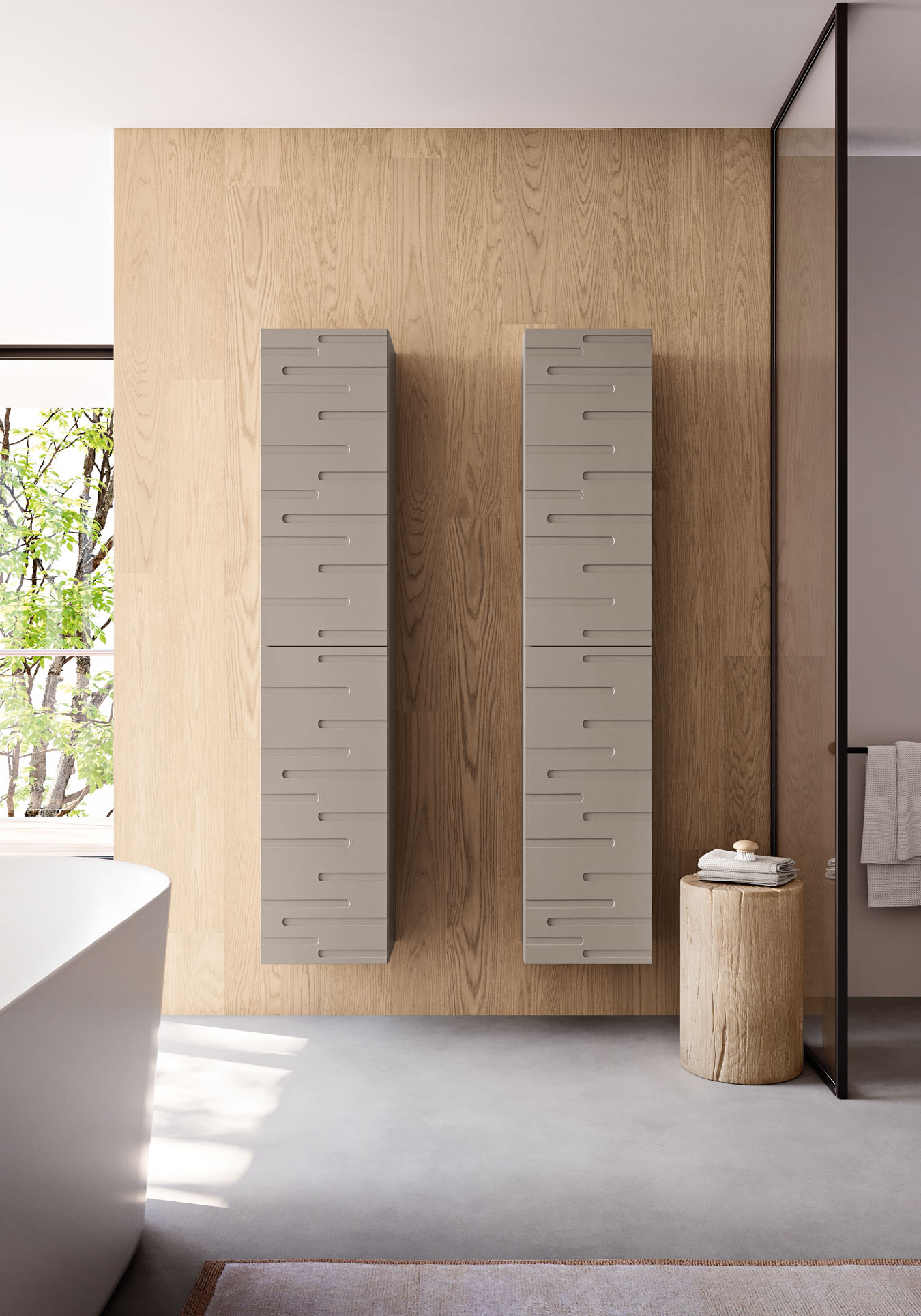 Palmas porta nel bagno un nuovo linguaggio estetico: incisioni verticali che evocano stalattiti e stalagmiti decorano i frontali delle basi, mentre nella colonna si trasformano in segni orizzontali, dando vita a un gioco grafico sorprendente. La collezione sospesa, con maniglia a gola, è realizzata in nobilitato e propone basi da 80 e 100 cm, disponibili in cinque varianti di colore - tre laccati e due effetto legno - per creare contrasti eleganti e dinamici. Il modello si completa con il cubotto Four e il pensile Smile, per dare vita a composizioni dal design unico, capaci di trasformare il bagno in un ambiente elegante e personale.