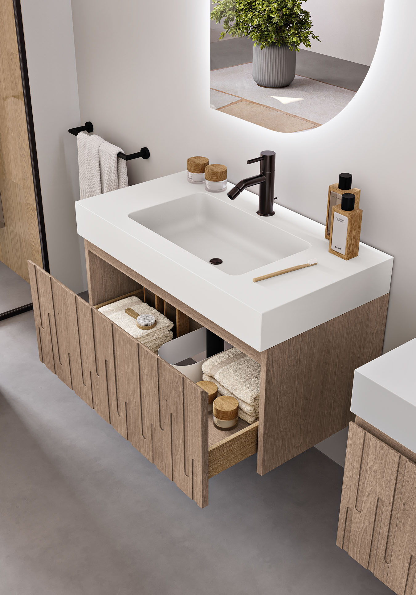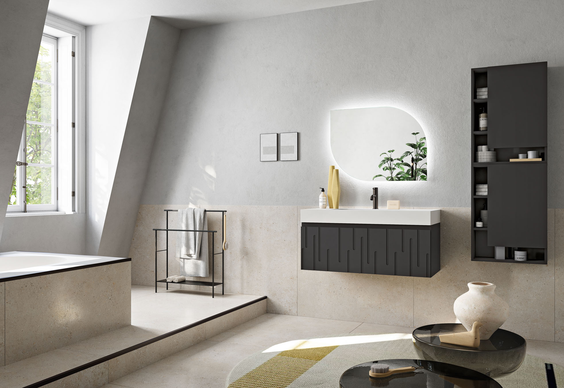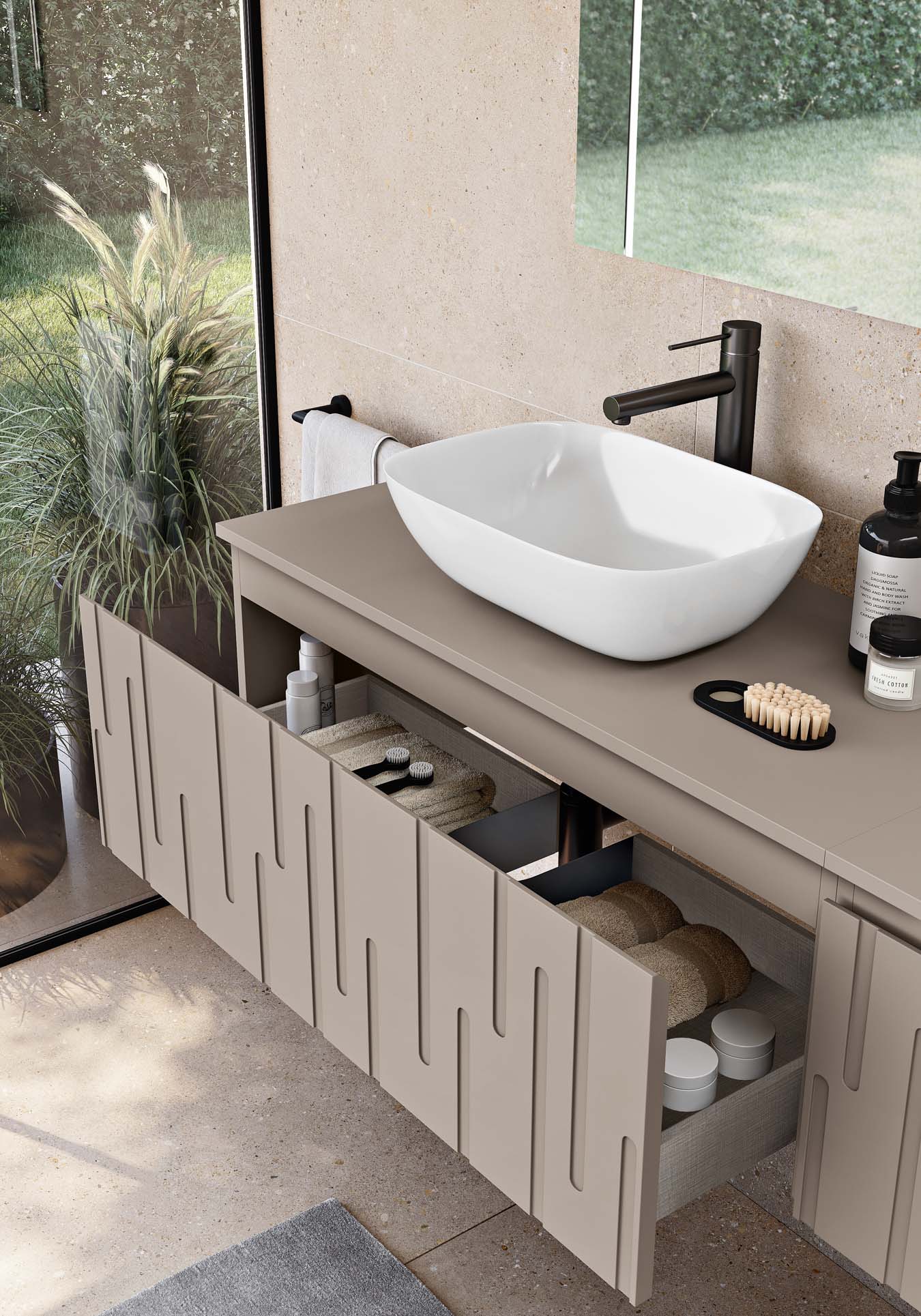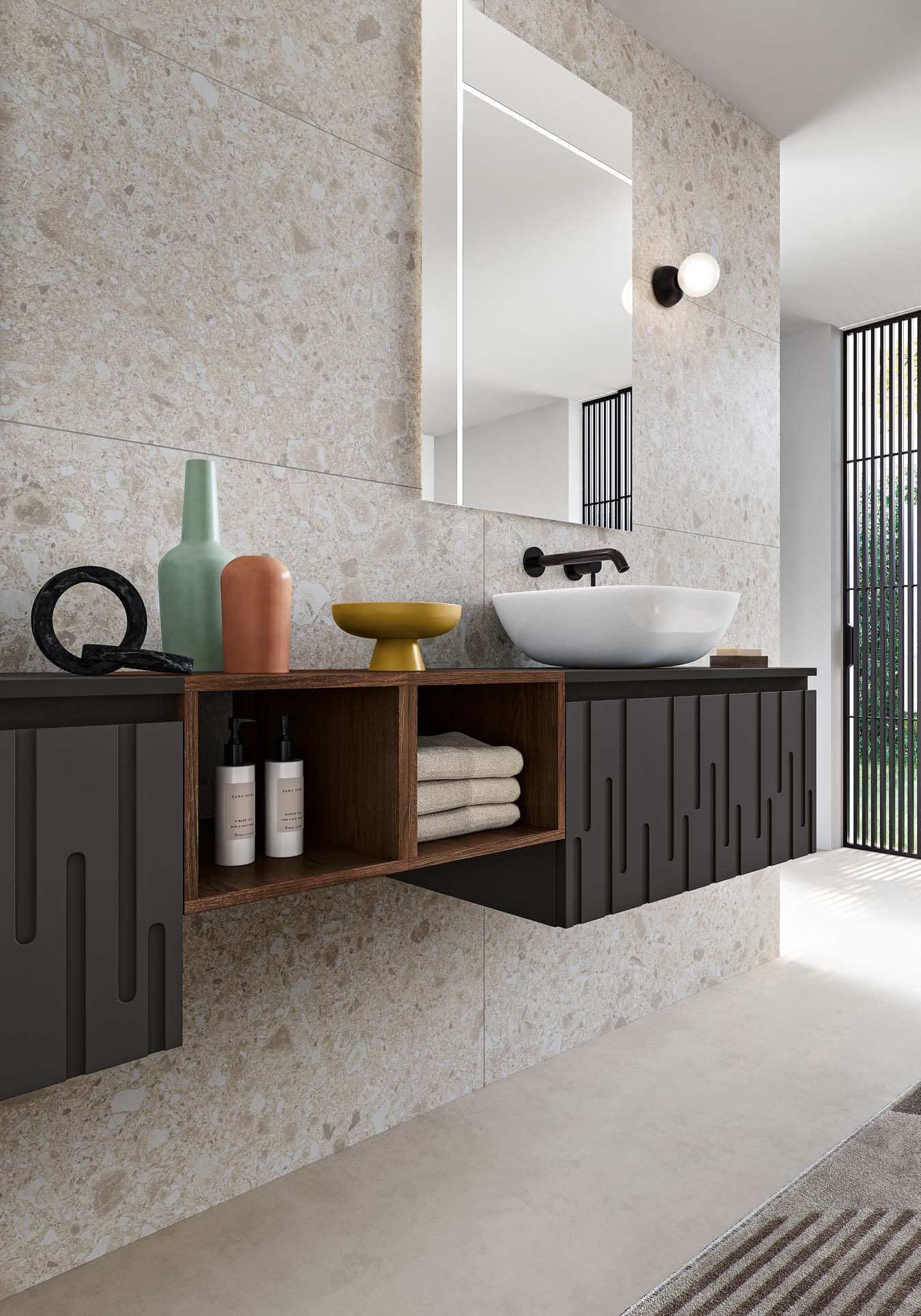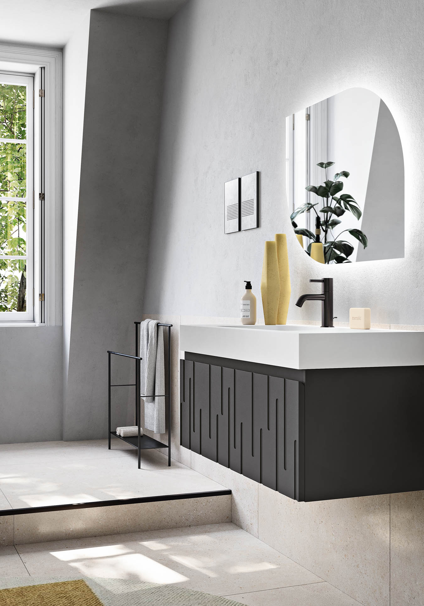 Palmas porta nel bagno un nuovo linguaggio estetico: incisioni verticali che evocano stalattiti e stalagmiti decorano i frontali delle basi, mentre nella colonna si trasformano in segni orizzontali, dando vita a un gioco grafico sorprendente. La collezione sospesa, con maniglia a gola, è realizzata in nobilitato e propone basi da 80 e 100 cm, disponibili in cinque varianti di colore - tre laccati e due effetto legno - per creare contrasti eleganti e dinamici. Il modello si completa con il cubotto Four e il pensile Smile, per dare vita a composizioni dal design unico, capaci di trasformare il bagno in un ambiente elegante e personale.