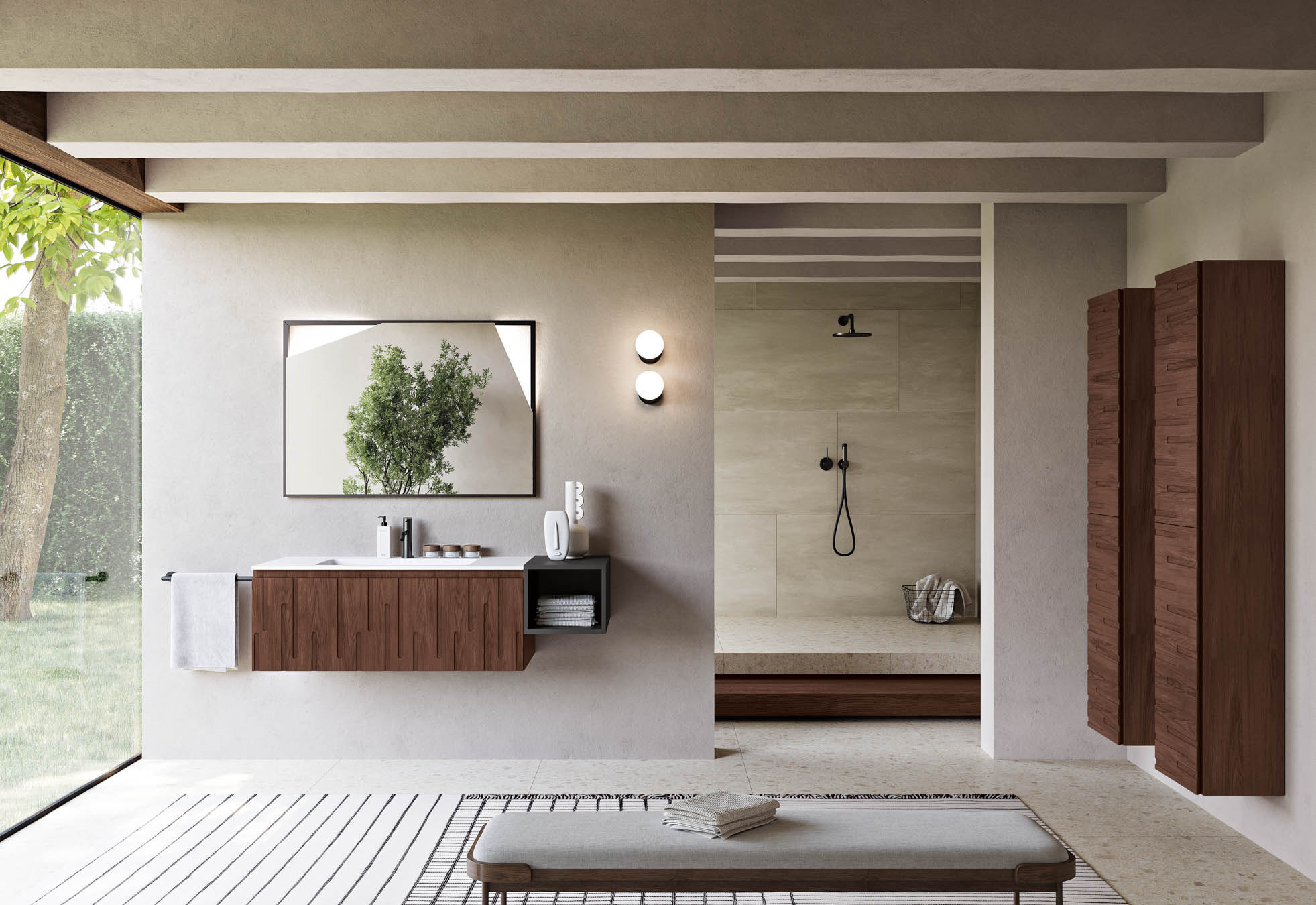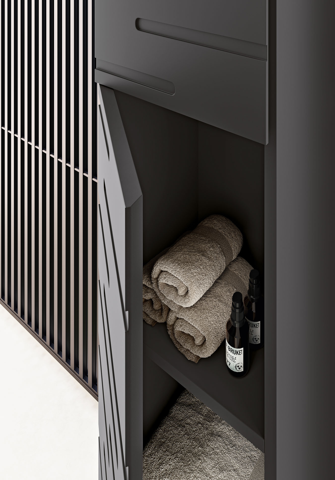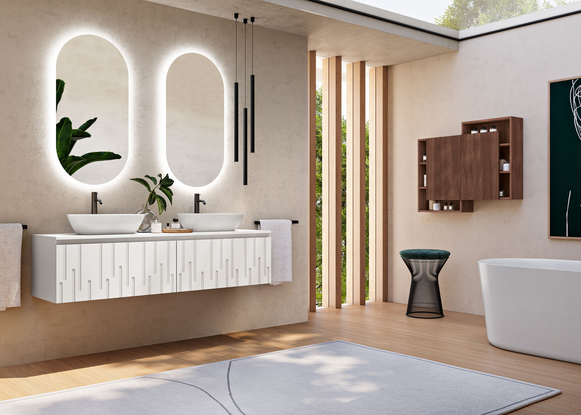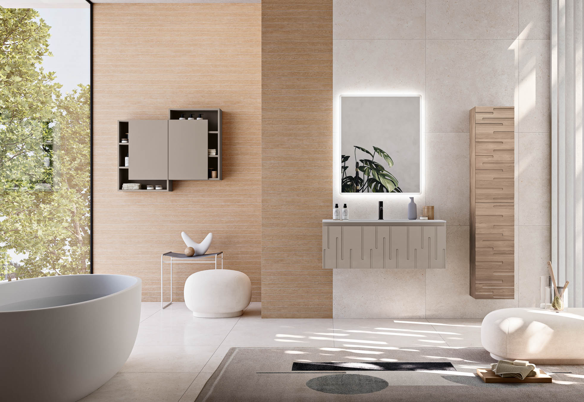 Palmas porta nel bagno un nuovo linguaggio estetico: incisioni verticali che evocano stalattiti e stalagmiti decorano i frontali delle basi, mentre nella colonna si trasformano in segni orizzontali, dando vita a un gioco grafico sorprendente. La collezione sospesa, con maniglia a gola, è realizzata in nobilitato e propone basi da 80 e 100 cm, disponibili in cinque varianti di colore - tre laccati e due effetto legno - per creare contrasti eleganti e dinamici. Il modello si completa con il cubotto Four e il pensile Smile, per dare vita a composizioni dal design unico, capaci di trasformare il bagno in un ambiente elegante e personale.