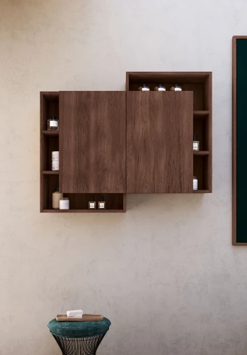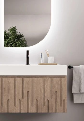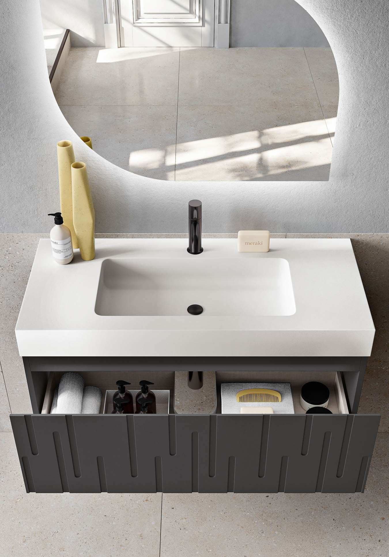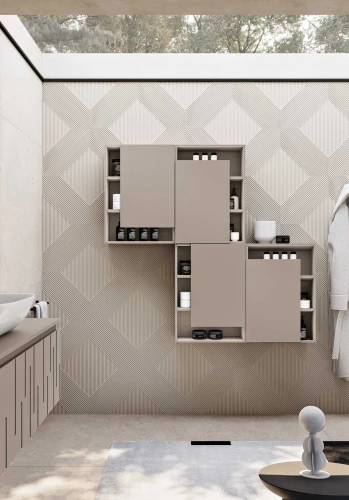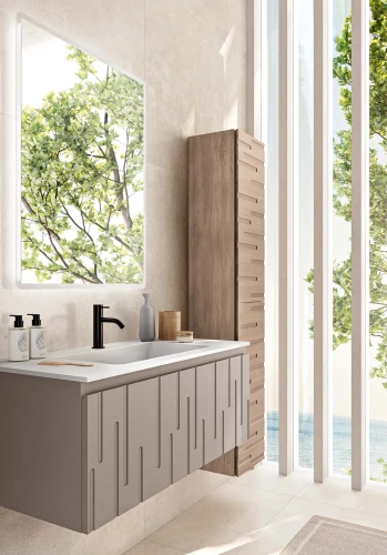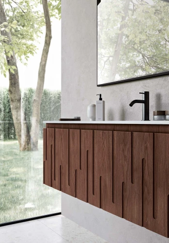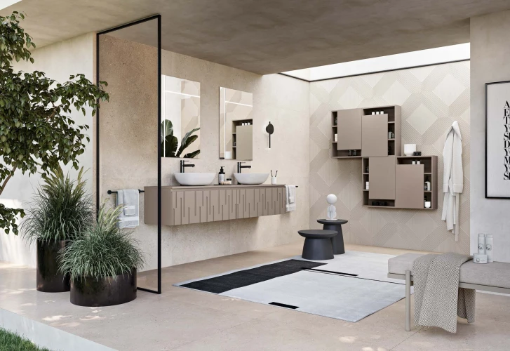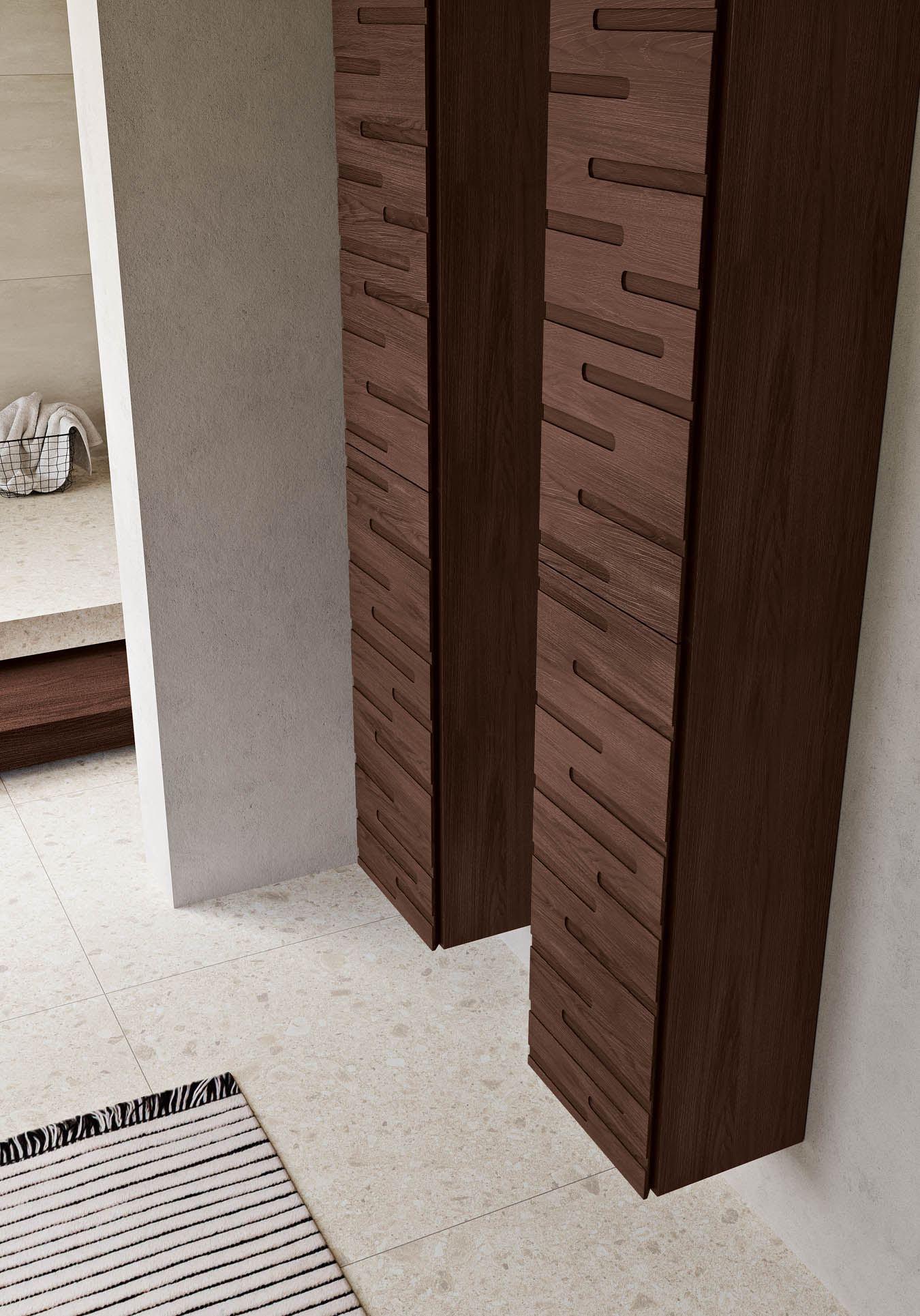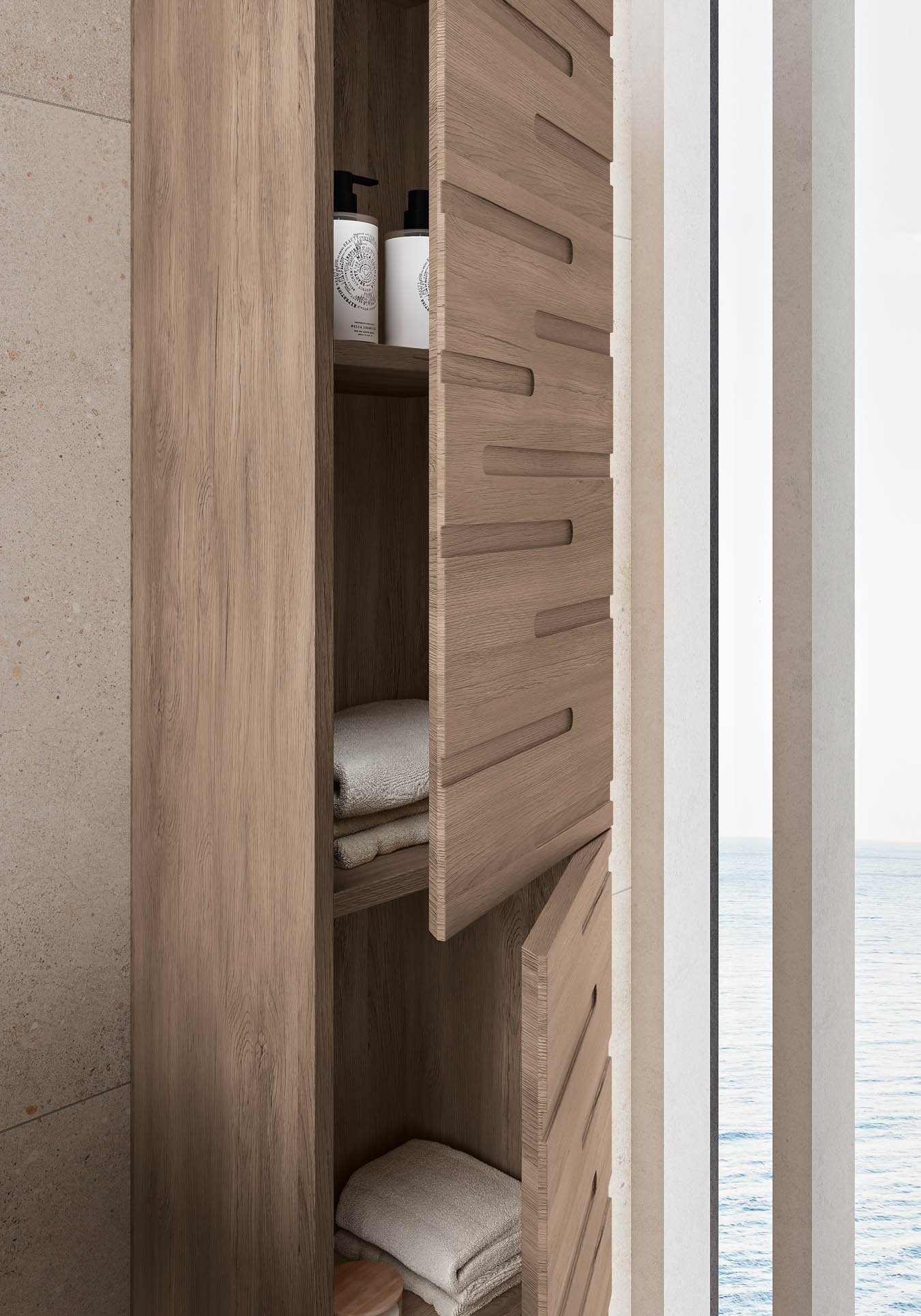 Palmas porta nel bagno un nuovo linguaggio estetico: incisioni verticali che evocano stalattiti e stalagmiti decorano i frontali delle basi, mentre nella colonna si trasformano in segni orizzontali, dando vita a un gioco grafico sorprendente. La collezione sospesa, con maniglia a gola, è realizzata in nobilitato e propone basi da 80 e 100 cm, disponibili in cinque varianti di colore - tre laccati e due effetto legno - per creare contrasti eleganti e dinamici. Il modello si completa con il cubotto Four e il pensile Smile, per dare vita a composizioni dal design unico, capaci di trasformare il bagno in un ambiente elegante e personale.