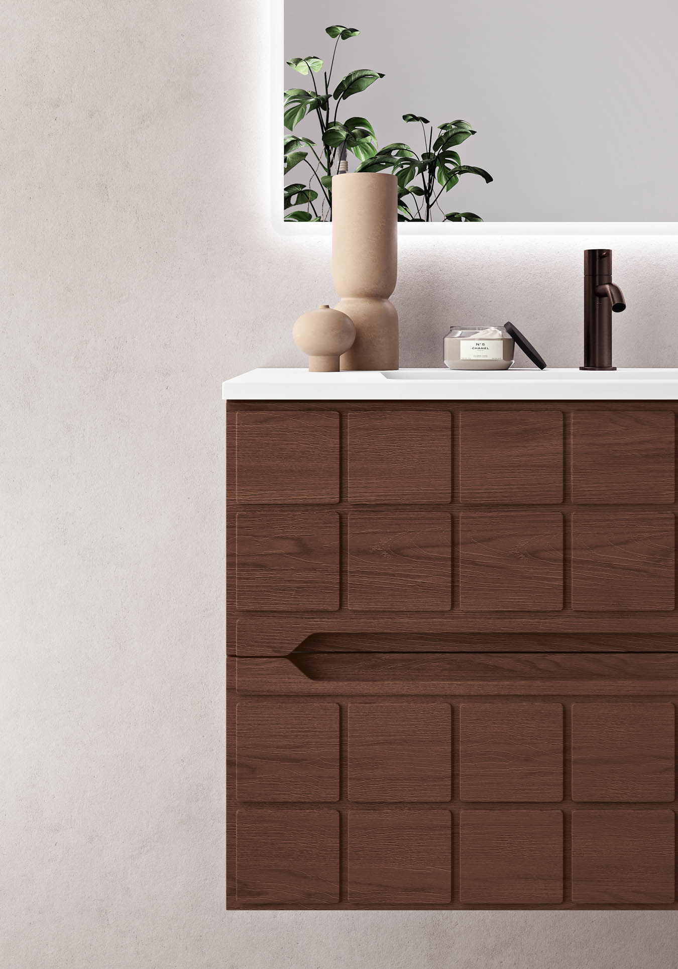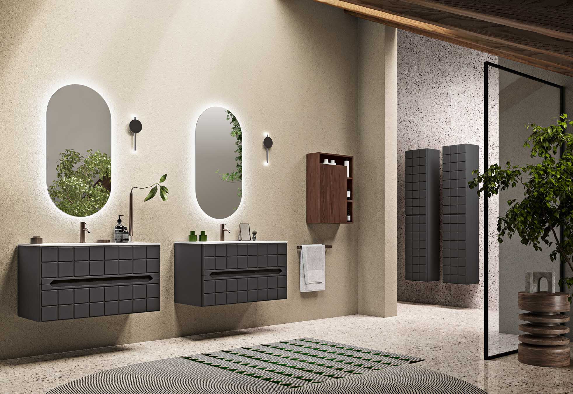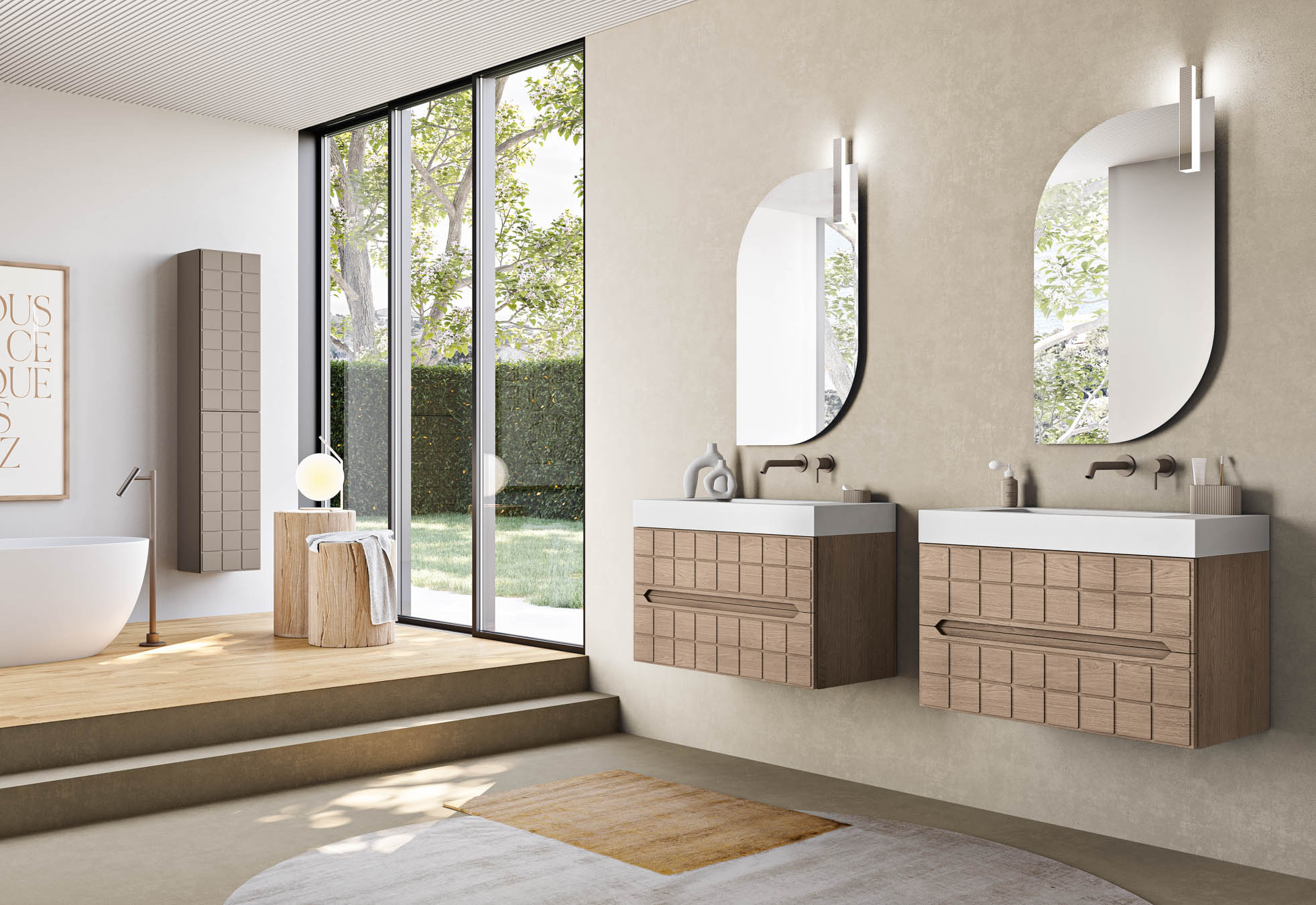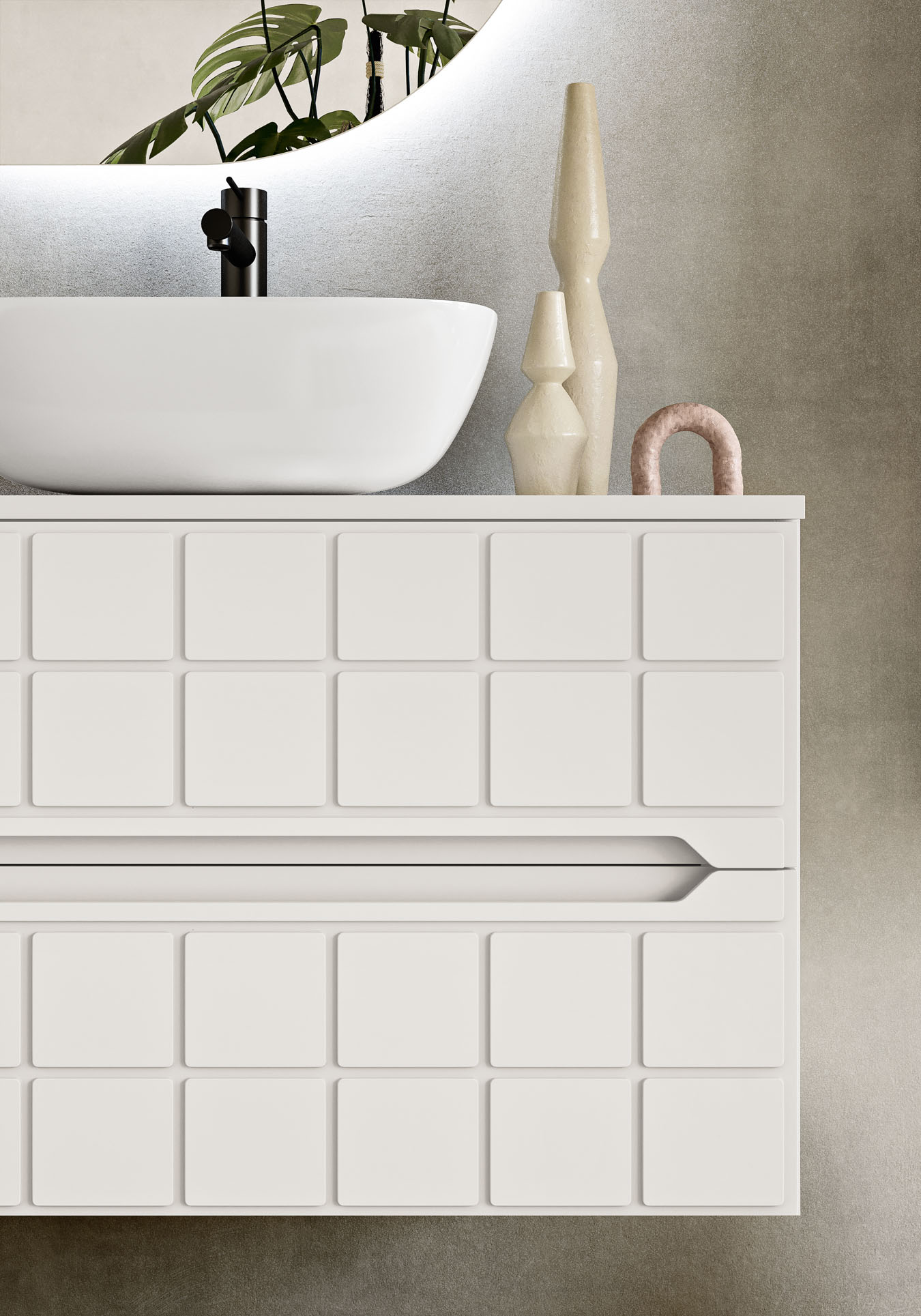 La nuova collezione di mobili bagno sospesi San Paolo, trasforma il bagno in uno spazio accogliente e dal design ricercato. A caratterizzarla è la particolare lavorazione dei frontali, decorati da quadrati a rilievo che, insieme alla maniglia sagomata integrata, creano un effetto architettonico elegante e distintivo. La linea propone basi da 90 cm e colonne abbinate, con struttura in nobilitato laccato o effetto legno. I cassetti con chiusura rallentata garantiscono un utilizzo confortevole e silenzioso, accompagnando con delicatezza i gesti di ogni giorno. La palette cromatica si declina in cinque tonalità — bianco, tortora, antracite, rovere nodi e tek — offrendo la possibilità di personalizzare lo spazio bagno con atmosfere raffinate e sempre attuali.