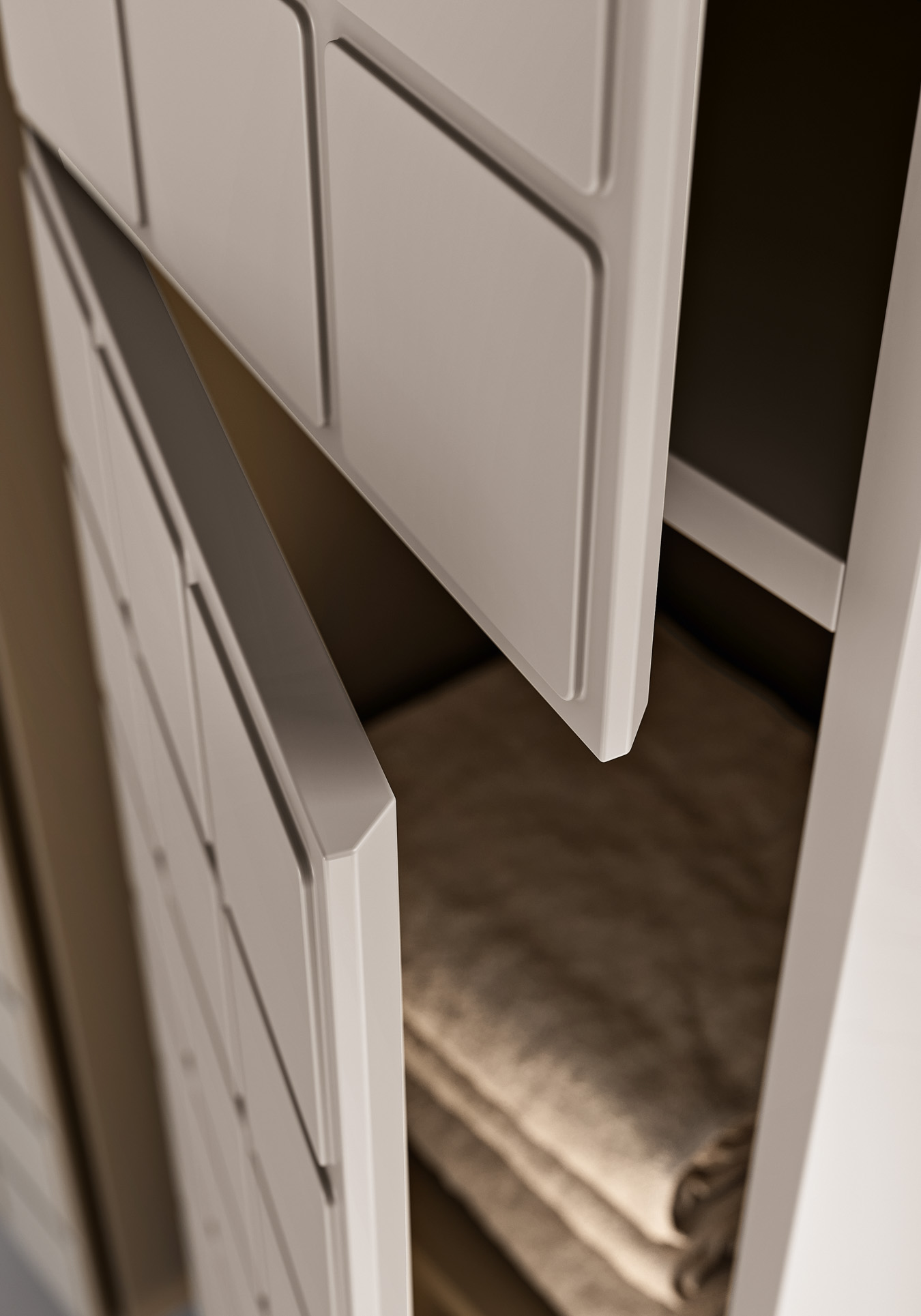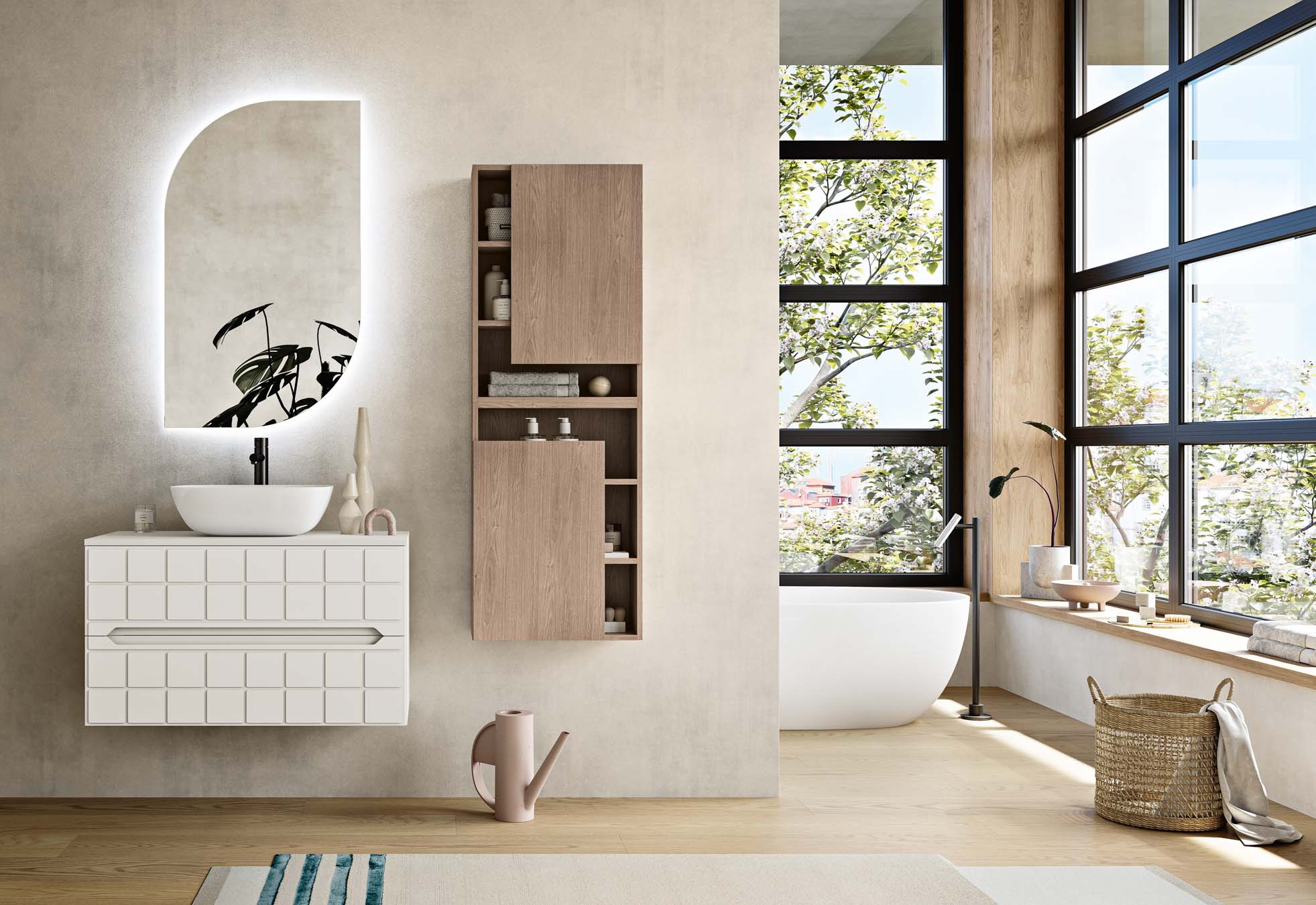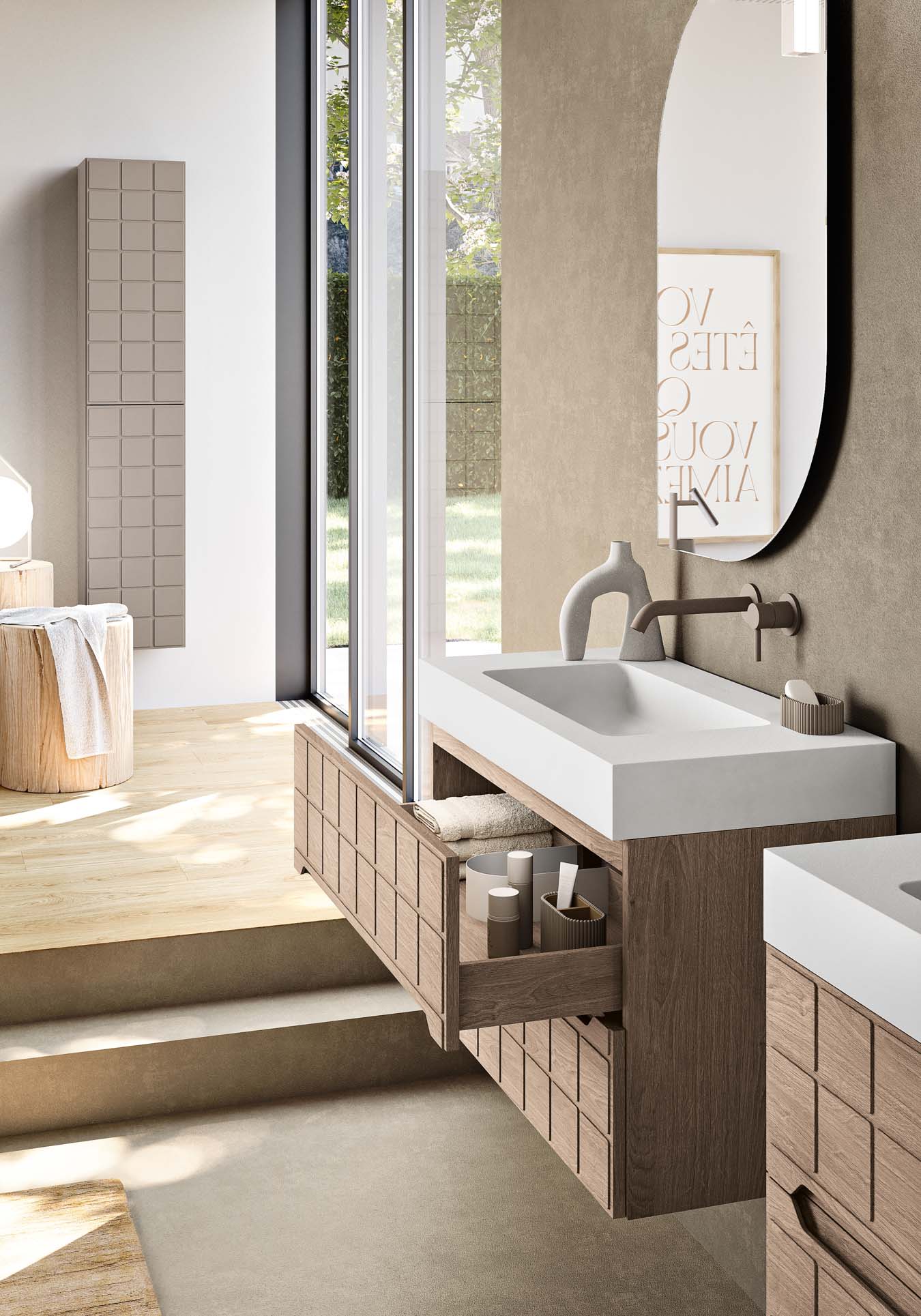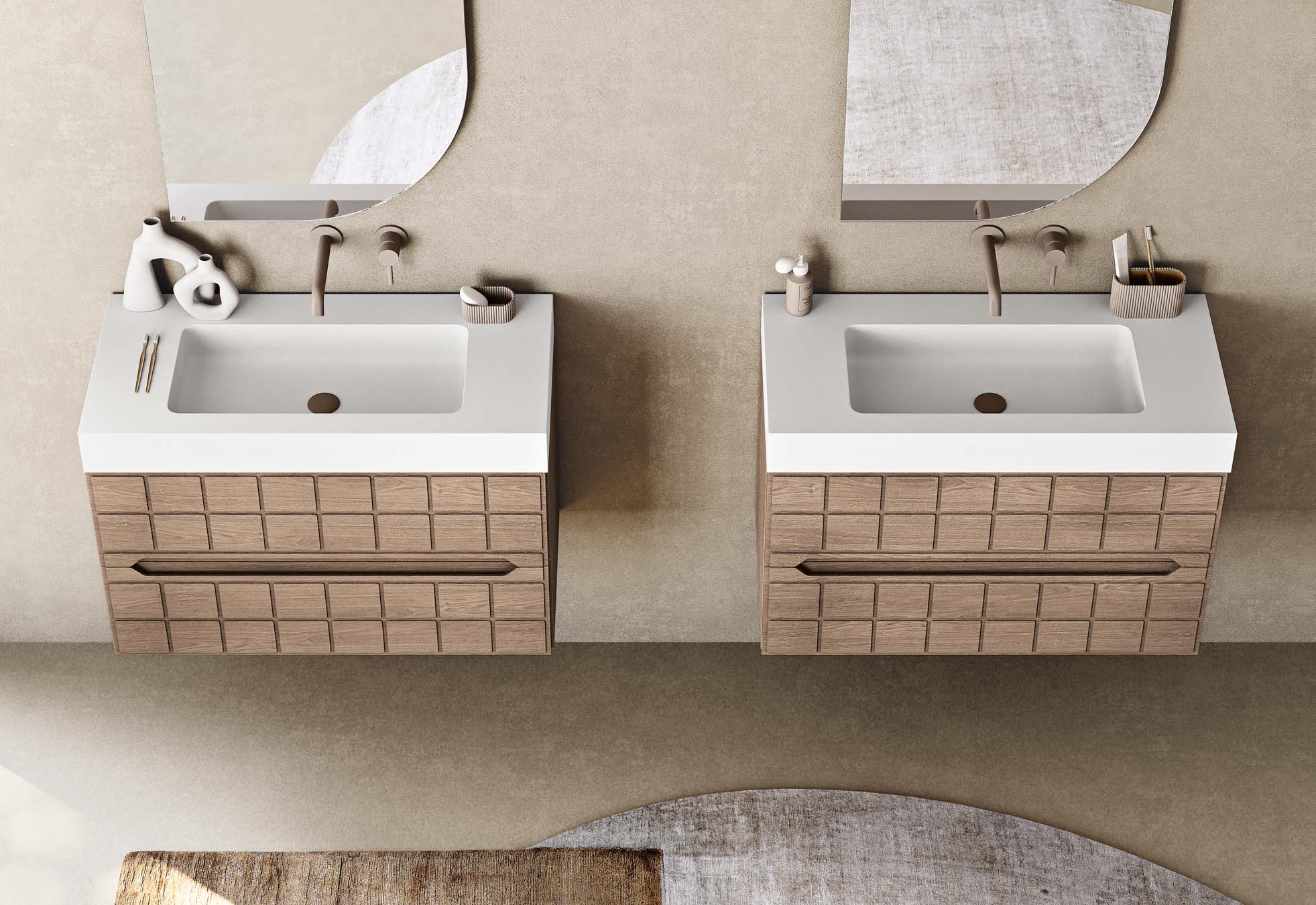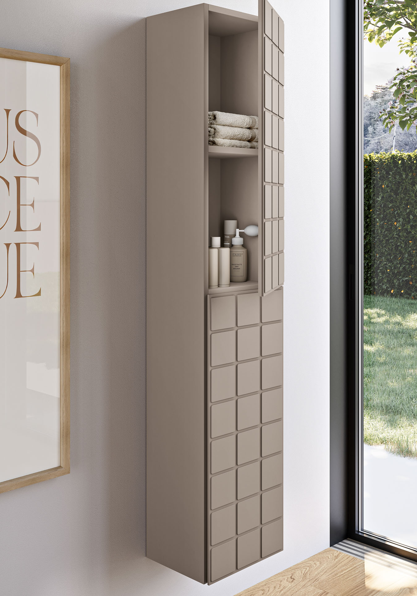 La nuova collezione di mobili bagno sospesi San Paolo, trasforma il bagno in uno spazio accogliente e dal design ricercato. A caratterizzarla è la particolare lavorazione dei frontali, decorati da quadrati a rilievo che, insieme alla maniglia sagomata integrata, creano un effetto architettonico elegante e distintivo. La linea propone basi da 90 cm e colonne abbinate, con struttura in nobilitato laccato o effetto legno. I cassetti con chiusura rallentata garantiscono un utilizzo confortevole e silenzioso, accompagnando con delicatezza i gesti di ogni giorno. La palette cromatica si declina in cinque tonalità — bianco, tortora, antracite, rovere nodi e tek — offrendo la possibilità di personalizzare lo spazio bagno con atmosfere raffinate e sempre attuali.