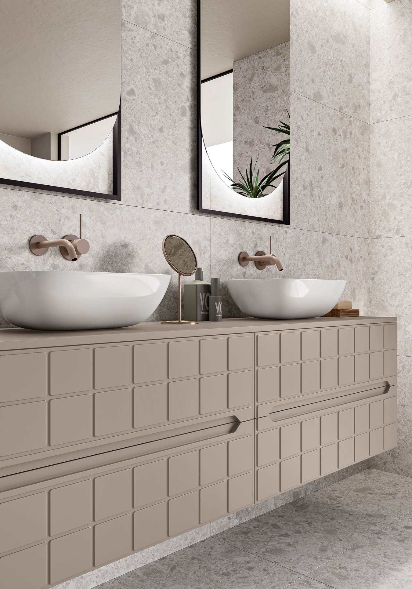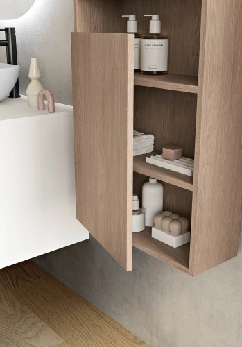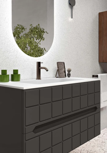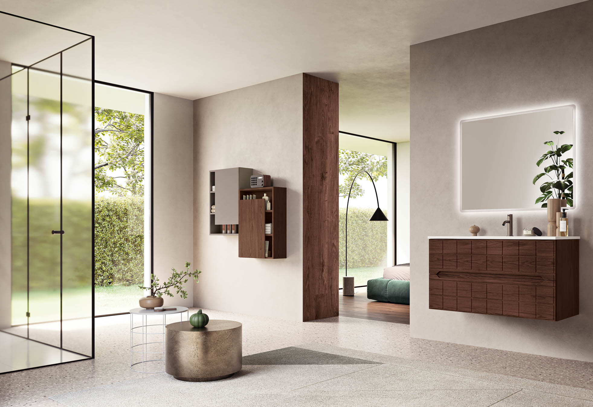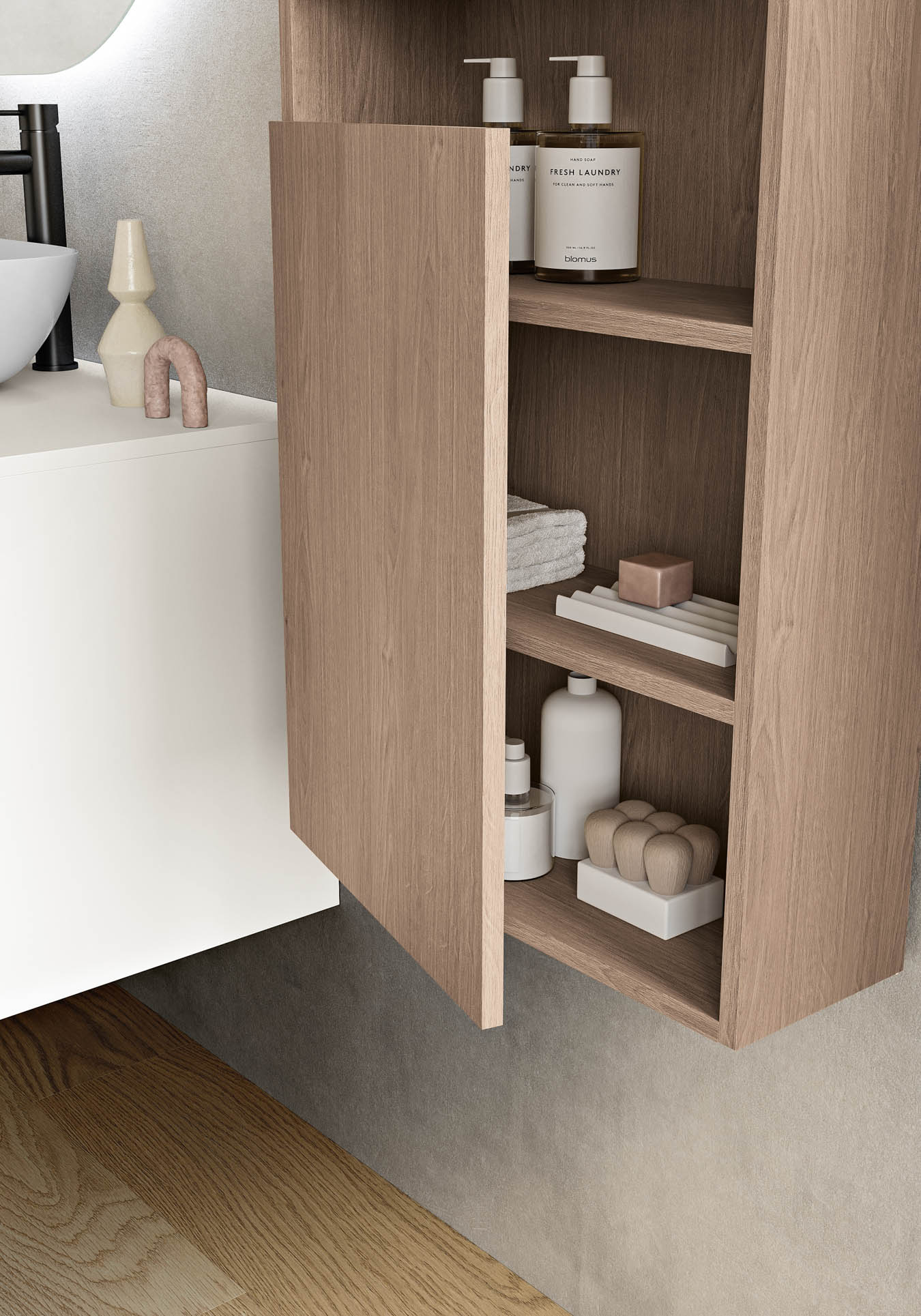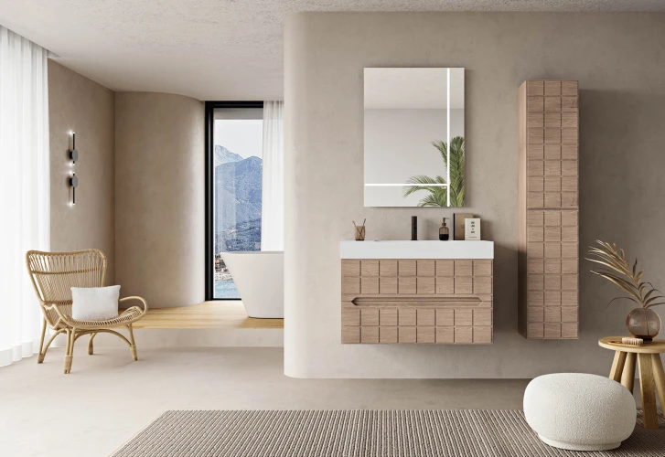 La nuova collezione di mobili bagno sospesi San Paolo, trasforma il bagno in uno spazio accogliente e dal design ricercato. A caratterizzarla è la particolare lavorazione dei frontali, decorati da quadrati a rilievo che, insieme alla maniglia sagomata integrata, creano un effetto architettonico elegante e distintivo. La linea propone basi da 90 cm e colonne abbinate, con struttura in nobilitato laccato o effetto legno. I cassetti con chiusura rallentata garantiscono un utilizzo confortevole e silenzioso, accompagnando con delicatezza i gesti di ogni giorno. La palette cromatica si declina in cinque tonalità — bianco, tortora, antracite, rovere nodi e tek — offrendo la possibilità di personalizzare lo spazio bagno con atmosfere raffinate e sempre attuali.