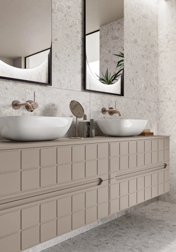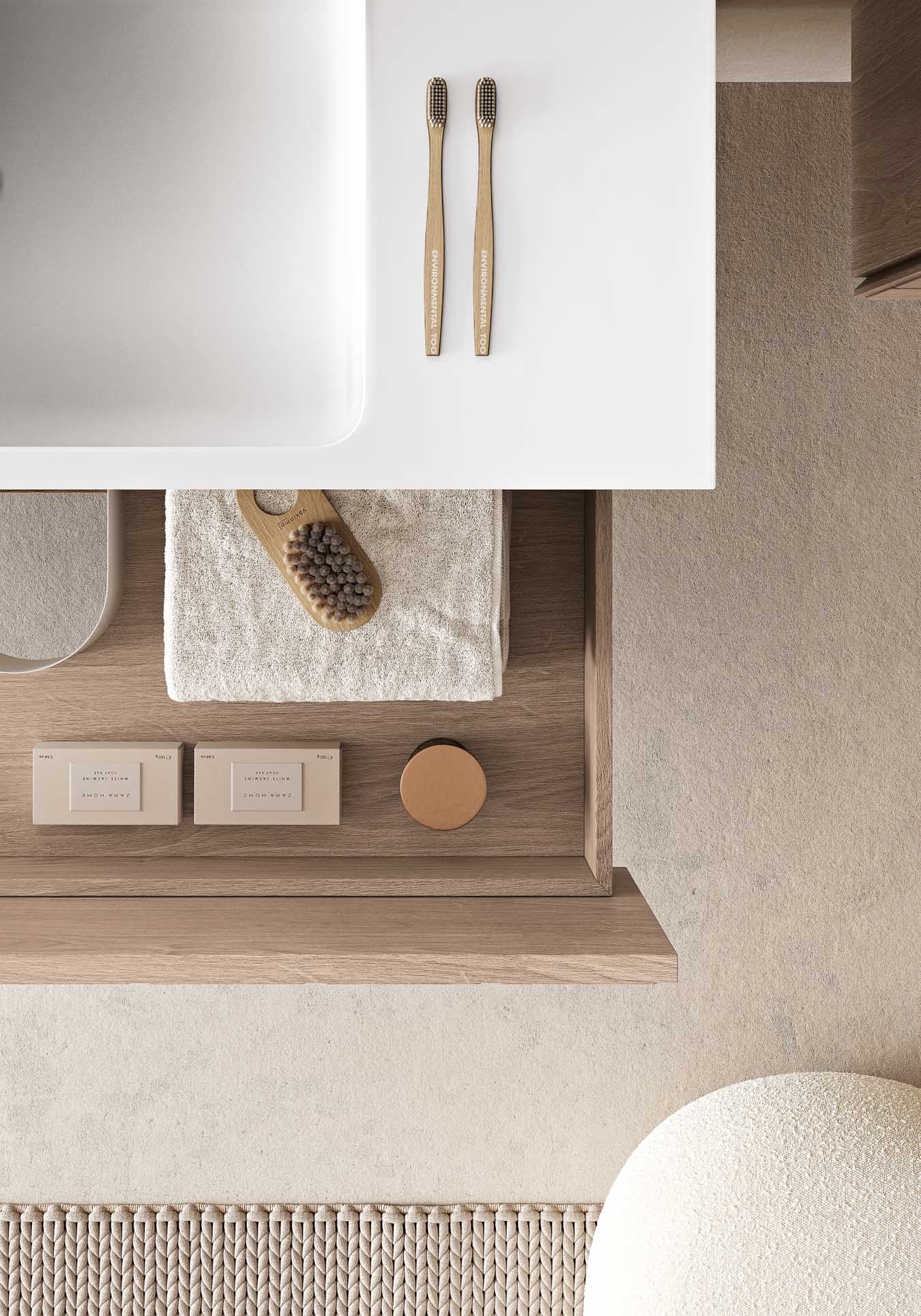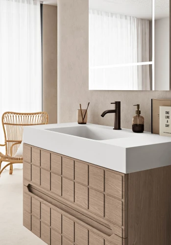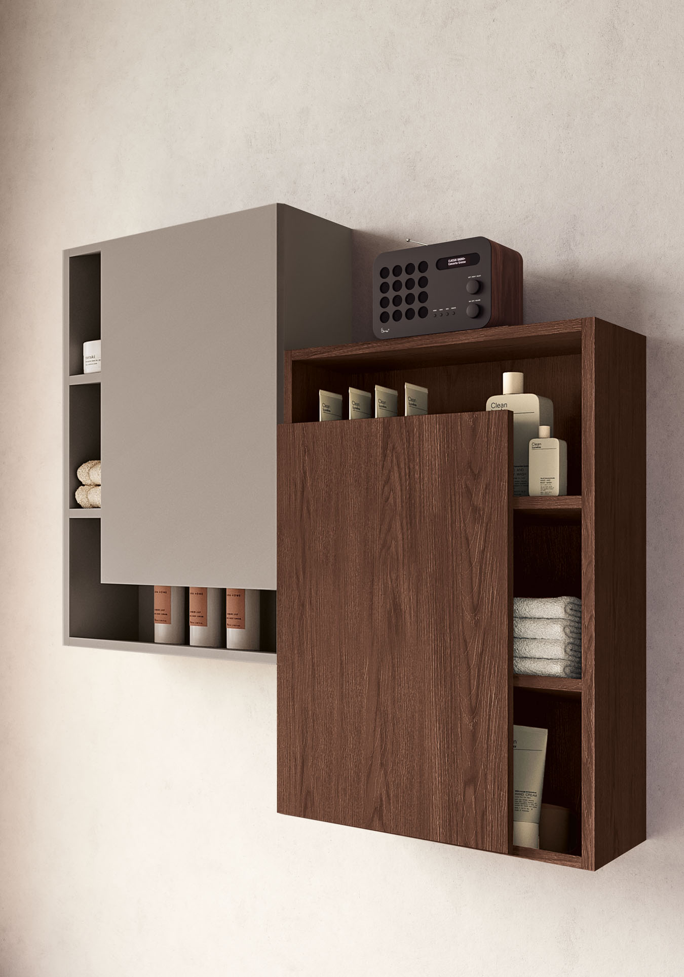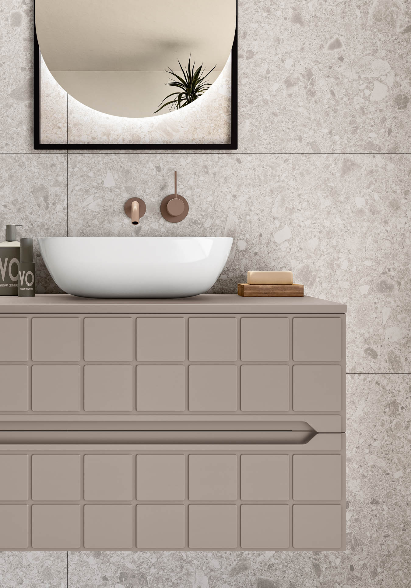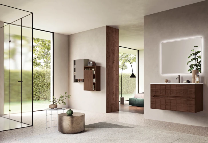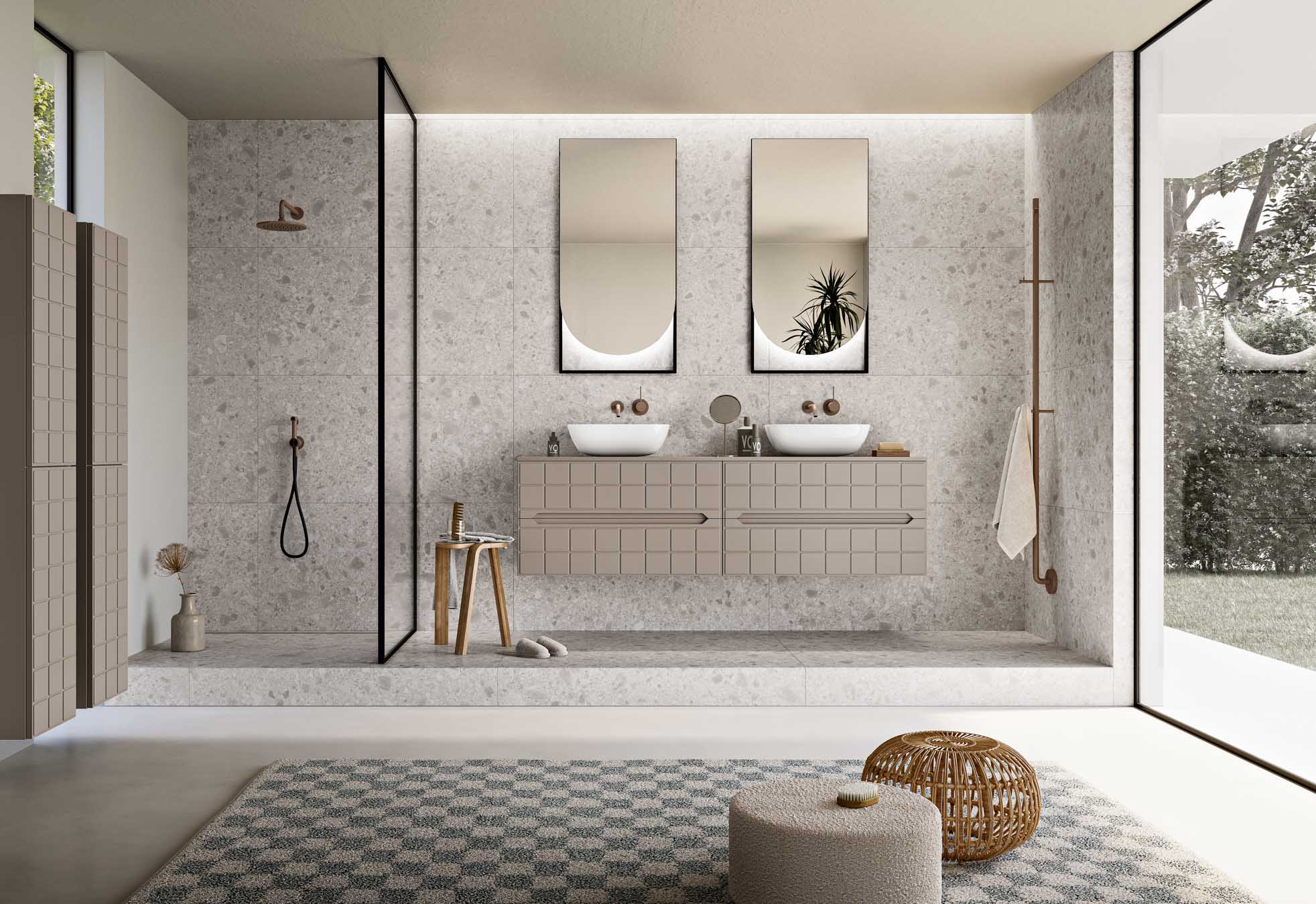 La nuova collezione di mobili bagno sospesi San Paolo, trasforma il bagno in uno spazio accogliente e dal design ricercato. A caratterizzarla è la particolare lavorazione dei frontali, decorati da quadrati a rilievo che, insieme alla maniglia sagomata integrata, creano un effetto architettonico elegante e distintivo. La linea propone basi da 90 cm e colonne abbinate, con struttura in nobilitato laccato o effetto legno. I cassetti con chiusura rallentata garantiscono un utilizzo confortevole e silenzioso, accompagnando con delicatezza i gesti di ogni giorno. La palette cromatica si declina in cinque tonalità — bianco, tortora, antracite, rovere nodi e tek — offrendo la possibilità di personalizzare lo spazio bagno con atmosfere raffinate e sempre attuali.