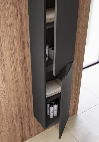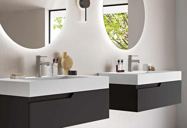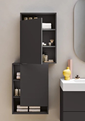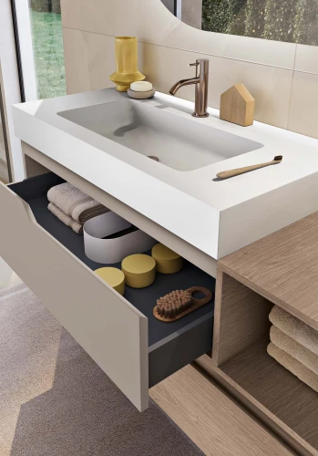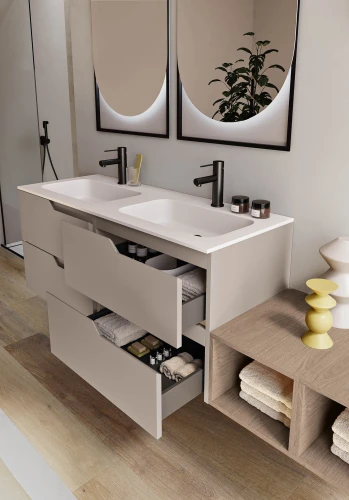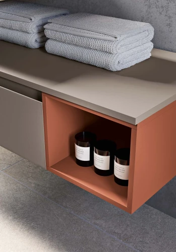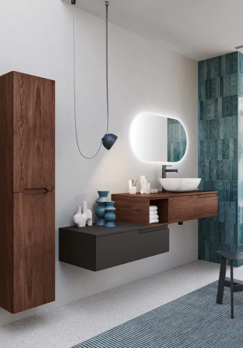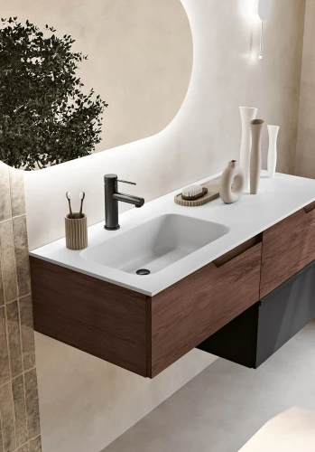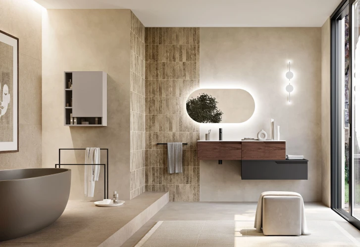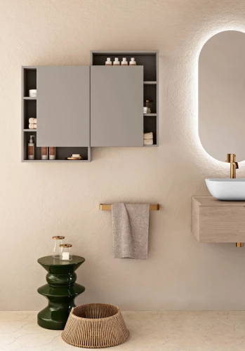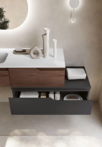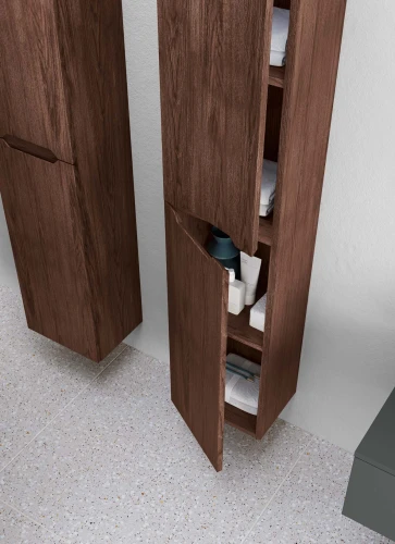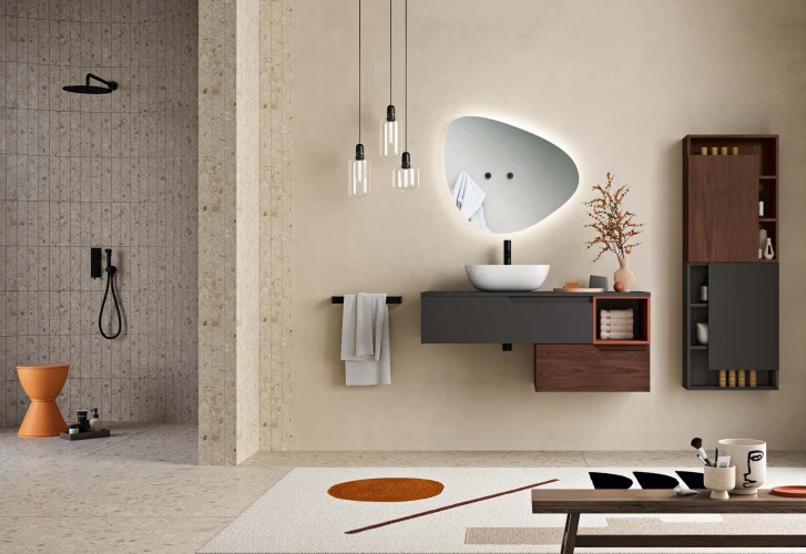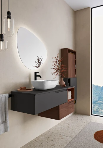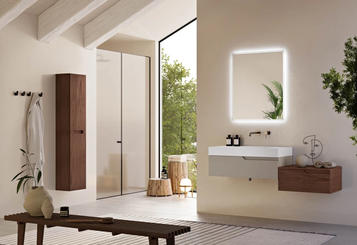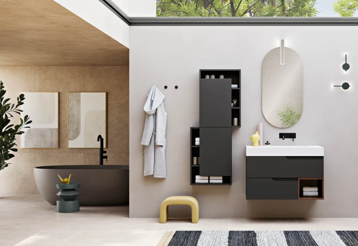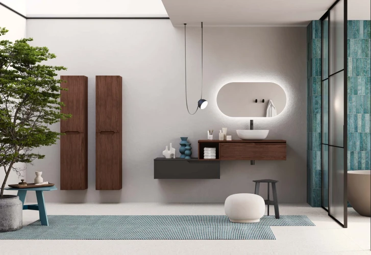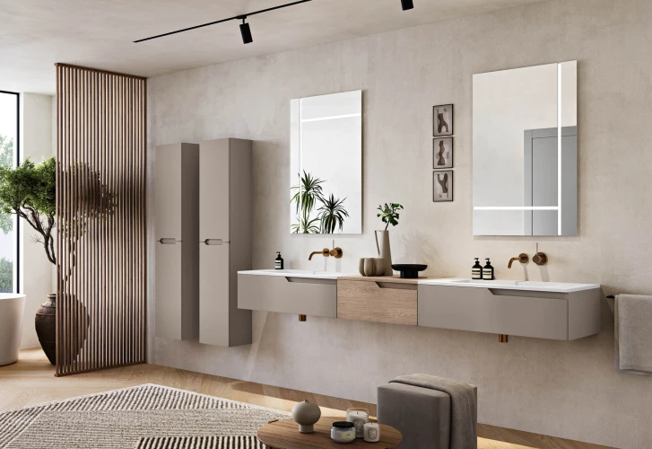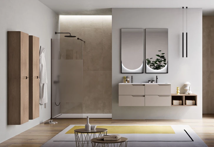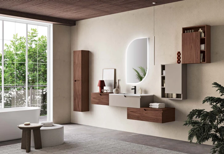 Smile è la nuova collezione di mobili bagno sospesi che unisce funzionalità e personalizzazione, trasformando il bagno in uno spazio accogliente. La linea si compone di basi da 60 e 90 cm, caratterizzate da una maniglia sagomata integrata nei frontali. I quattro colori disponibili - tortora e antracite laccato, rovere nodi e tek in nobilitato effetto legno - consentono di creare atmosfere diverse e su misura con il proprio stile. Accanto alle basi la collezione si arricchisce di elementi unici: un pensile con anta più piccola rispetto alla cornice, che lascia intravedere i ripiani interni sui lati e nella parte superiore, creando un raffinato gioco di pieni e vuoti; un box contenitore, perfetto da abbinare alle basi con tocchi di colore e originalità, grazie anche alla variante ruggine che aggiunge carattere e vivacità alla composizione. Con Smile, ogni elemento diventa parte di un progetto che fonde bellezza e praticità, trasformando il bagno in un ambiente da vivere con piacere, giorno dopo giorno… facendoti sorridere.